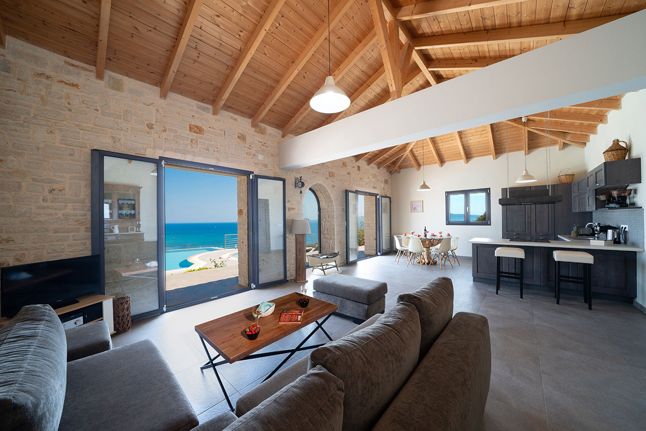 The interiors are inspired by the beauty and simplicity of Kefalonia while the traditional stone architecture of the exteriors blend perfectly with the landscape.